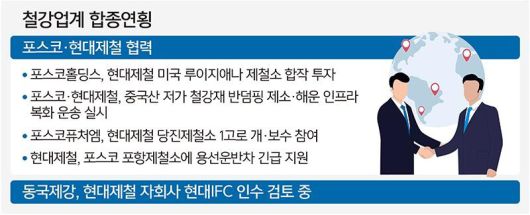 포스코와 현대제철은 과거에도 협력하는 모습을 보여줬다. 중국산 저가 철강재가 국내 시장에 범람하던 2015년 양사는 반덤핑 제소와 함께 품질 인증제 강화 등에 힘을 모았다. 2021년에는 광양항과 평택·당진항 구간의 해운 인프라를 공유하는 복화 운송을 실시했다. 2022년엔 포스코케미칼(현 포스코퓨처엠)이 현대제철의 당진제철소 1고로 개·보수 작업에 참여했다. 그해 9월에는 태풍 힌남노로 냉천이 범람해 수해를 입은 포스코 포항제철소의 빠른 복구를 위해 현대제철이 당진제철소에서 운영하던 용선운반차 5대를 긴급 제공했다.