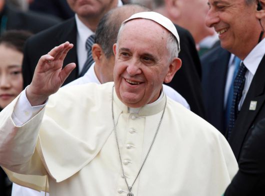 한국을 방문한 프란치스코 교황이 14일 오전 경기 성남시 수정구 서울공항을 나서며 기아 쏘울에 탑승해 환영객들에게 손흔들고 있다. 프란치스코 교황은 취임 초기부터 방탄차를 이용하지 않겠다고 공언했으며, 실제 한국 방문 때도 가장 작은 차를 타고 싶다는 뜻을 한국 천주교 교황방한준비위원회에 전달해온 것으로 알려졌다. 이에 따라 방한 기간 중 교황은 기아자동차의 1600cc급 소형 승용차인 쏘울을 탔다. 2014.8.14/뉴스1 |