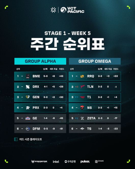 알파 그룹에서 붐 이스포츠에 이어 2위를 차지한 DRX는 5주 차에서 탈론 이스포츠에게 패하면서 오메가 그룹 3위로 마무리한 T1과 플레이오프 1라운드에서 맞대결을 펼치고 젠지는 알파 그룹 2위인 탈론 이스포츠와 대결한다. 농심 레드포스는 패자조 1라운드부터 플레이오프를 시작한다.