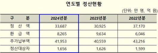 직장가입자의 2024년 귀속 근로소득에 대한 건강보험료 정산 결과, 총 정산 금액은 3조 3,687억 원이다. 2023년 귀속(3조 925억 원) 대비 약 8.9% 증가했다. 2022년 귀속(3조 7,170억 원) 대비 약 9.4% 감소한 수치이다.