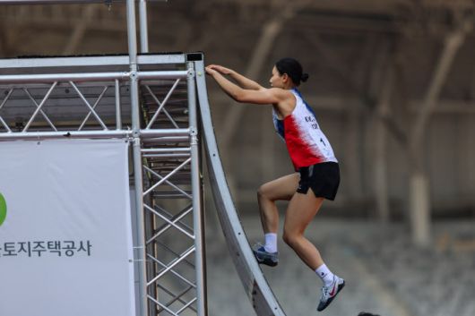 근대5종 종목에 새로 적용된 장애물 경기. 국가대표 김유리가 아시아선수권대회에서 ‘피니시월’을 오르고 있다. 사진=대한근대5종연맹 |