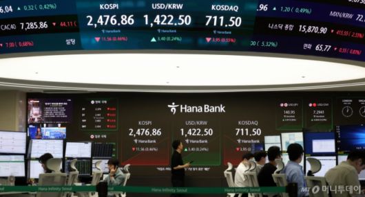 코스피와 코스닥지수가 하락 출발한 22일 오전 서울 중구 하나은행 딜링룸 전광판에 지수가 표시되고 있다.코스피는 전 거래일 대비 7.24포인트(0.29%) 내린 2488.42에, 코스닥지수는 4.03포인트(0.56%) 내린 711.42에 장을 시작했다. /사진=뉴시스 |
