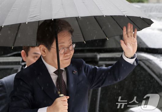 대권 도전에 나선 이재명 더불어민주당 전 대표가 22일 오전 서울 서초구 서울중앙지방법원에서 열린 '대장동 배임 및 성남FC 뇌물' 1심 속행 공판에 출석하며 지지자들에게 손인사를 하고 있다. 2025.4.22/뉴스1 ⓒ News1 오대일 기자 |