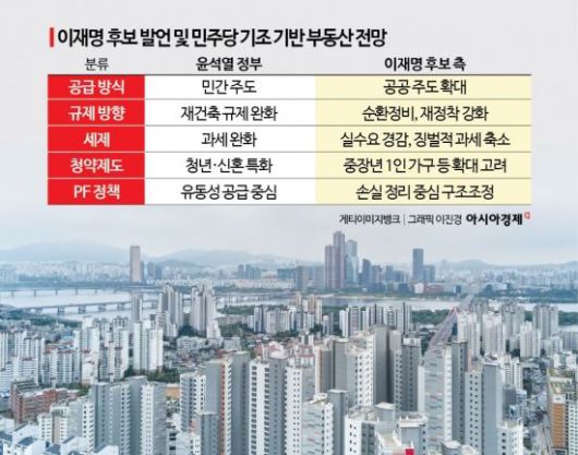 ◆부동산PF 구조조정 본격화 전망…청약제도 조정 가능성= 부실한 부동산 프로젝트파이낸싱(PF)은 구조조정이 이뤄질 가능성이 크다. 전문가들은 윤석열 정부에서는 건설사 부실을 우려해 유동성 공급 위주로 대응했지만, 이 전 대표 집권 시에는 손실을 확정하고 정리하는 방향으로 기조가 전환될 가능성이 크다고 보고 있다. 더불어민주당은 2023년 12월 "지금은 국민 세금으로 PF를 연명할 때가 아니라 정리할 때"라며 "과도한 개발이익을 추구한 시행사와 건설사, 금융기관이 자기책임 원칙 아래 해결하도록 해야 한다"고 강조한 바 있다. 민생연석회의 자문위원은 PF 구조조정과 관련해 "이번에는 현장 정리를 본격적으로 시행할 것으로 보인다"며 "지난 1년 반 동안은 구조조정 방향을 놓고 말장난만 하다 시간을 허비했고, 그 결과 더는 버틸 수 없는 상황에 이르렀다"고 설명했다.