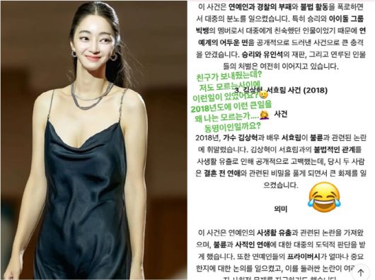 이 글에는 2018년 서효림이 클릭비 출신 김상혁과 불륜을 저질렀다고 주장하는 내용이 들어있다. 이에 서효림은 "친구가 보내줬는데 저도 모르는 사이에 이런 일이 있었어요? 2018년도 이런 큰일을 왜 나는 모르는가. 동명이인일까요?"라며 궁금증을 나타냈다.