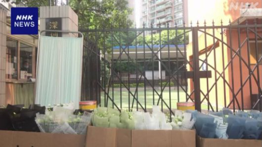 중국 선전시 일본인학교 교문 앞에 희생자를 추모하는 꽃이 놓여져 있다. NHK. |