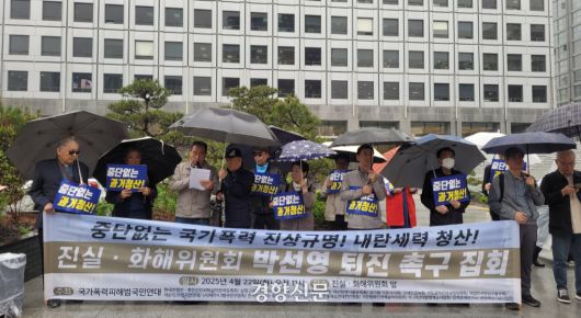 삼청교육 피해자유족회 등으로 구성된 국가폭력피해범국민연대는 22일 오전 서울 중구 진화위 앞에서 기자회견을 열었다. 이들은 “국가폭력 피해자를 위로해야 할 진화위에 비상계엄을 옹호하고 군사쿠데타를 지지하는 위원장이 자리를 지키는 것은 또 다른 국가폭력”이라며 박 위원장의 사퇴를 요구했다.