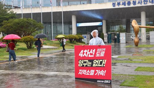 (춘천=연합뉴스) 박영서 기자 = 김왕규 강원특별자치도의원(양구·국민의힘)이 접경지역의 열악한 도로 사정과 사회간접자본(SOC) 확충 필요성을 알리기 위해 22일 세종시 정부청사 앞에서 빗속 1인 시위에 나섰다.