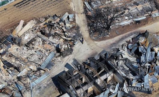 지난달 31일 경북 청송군 진보면 기곡리 한 마을이 산불에 초토화가 된 가운데 마을 주민이 주택 폐허를 살펴보고 있다. 연합뉴스 |