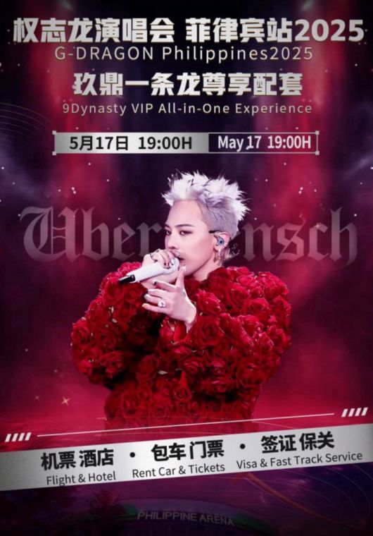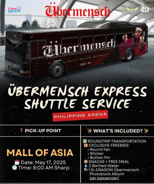 또한 오는 5월 17일 공연을 앞두고 필리핀 현지에서도 반응이 뜨거운 것으로 전해진다. 콘서트 당일 위버멘쉬 급행 셔틀버스를 운영하며, 각종 SNS와 온라인 커뮤니티 상에서 지드래곤 포스터가 확산 중이다.
