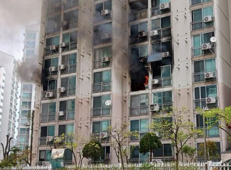 지난 21일 서울 관악구 봉천동 한 아파트에서 화재가 발생해 불길과 함께 연기가 피어오르고 있다. /연합뉴스 |