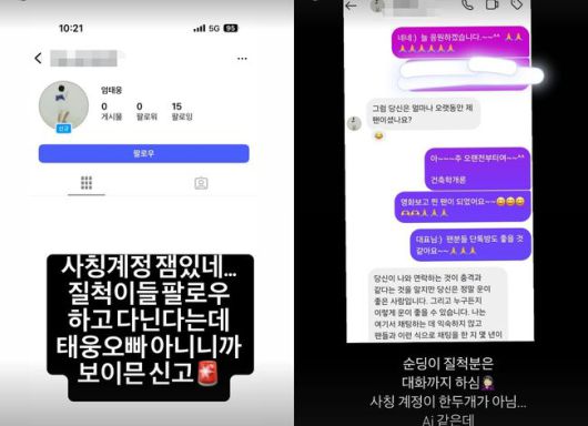 공개된 캡처 속에는 엄태웅의 계정을 사칭한 사칭범의 프로필이 담겼다. 특히 사칭 계정과 실제 팬의 대화가 담기기도.