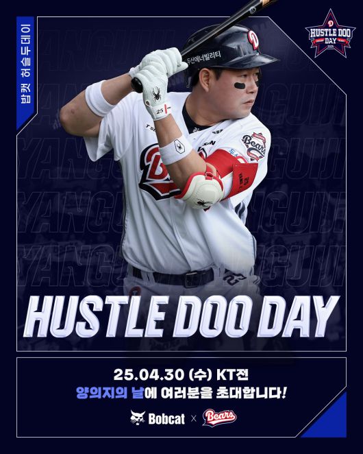 두산 베어스는 오는 30일 서울 잠실구장에서 열리는 KT 위즈와 정규시즌 홈 경기에서 '양의지 밥캣허슬두데이' 행사를 진행한다고 22일 밝혔다.(두산 베어스 제공) |