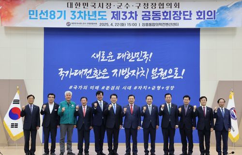 (대구=연합뉴스) 박세진 기자 = 대한민국시장군수구청장협의회는 22일 전남 장흥군 통합의학컨벤션센터에서 공동회장단 회의를 하고 6·3 조기 대선에 출마한 후보들과 각 정당에 지방분권 실현을 위한 공약 마련을 촉구하는 건의문을 발표했다.