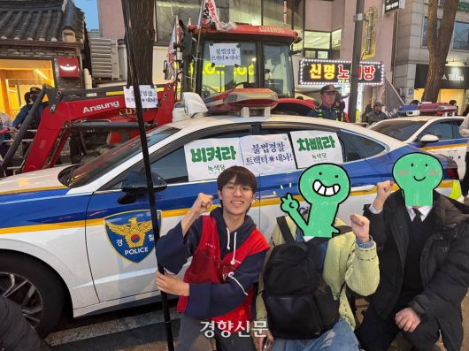 청소년인권행동 아수나로 상근활동가 수영(활동명·18)이 지난달 26일 서울 종로구 집회 현장의 전국농민회총연맹의 트랙터와 경찰차 앞에서 사진을 찍고 있다. 수영 제공 |