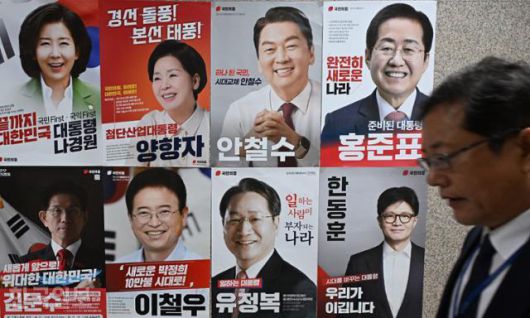 4인 컷오프 발표를 하루 앞둔 21일 국회 본관 복도에 국민의힘 대선 경선 주자 8명의 포스터가 붙어 있다. 고영권 기자 |