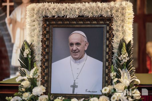 [서울=뉴시스] 정병혁 기자 = 제266대 교황인 프란치스코 교황이 선종한 가운데 22일 서울 중구 명동대성당 지하성당에 빈소가 마련되어 있다. 2025.04.22. jhope@newsis.com |