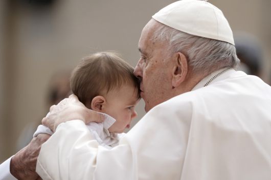 2023년 3월 8일(현지시간) 프란치스코 교황이 한 어린이의 이마에 입 맞추고 있다. (AP/뉴시스)