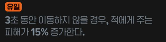 3초 동안 이동하지 않을 경우 공격력이 15% 증가한다. 적의 넉백에도 해제되고, 재발동하려면 최소 한 발자국이상 움직여야하는 제약이 있다. 장궁병 등 말뚝딜 직업에는 꽤 적합하지만, 제약이 많다는 단점이 있다.