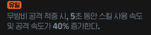 무방비 공격 적용 시 5초 간 스킬 사용 속도와 공격 속도가 40% 증가하는 효과다. 거의 모든 직업이 브레이크 스킬을 갖고 있기 때문에 범용적으로 사용할 수 있는 매우 좋은 옵션이다. 다만, 상시 발동은 어렵다는 단점이 있다.