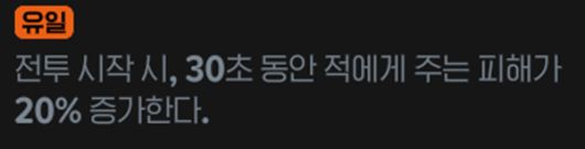체력이 75% 이상일 경우 공격력 11% 증가 효과를 낸다. 텍스트에는 '주는 피해'로 명시돼 있는데 공격력 증가다. 조건 만족이 꽤 까다로워보이지만, 현재 콘텐츠에서 물약과 붕대의 효율이 매우 좋아 체력 유지가 쉽다.