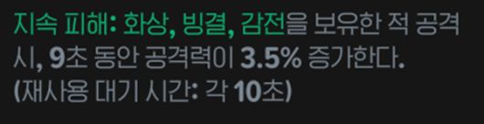 감전/빙결/화상인 적 공격 시 공격력 10.5% 증가 효과를 받는다. 지속피해 룬과 조합하면 효율이 좋지만, 흡혈과 마찬가지로 트리거가 없다면 효과가 없는 것과 같다.