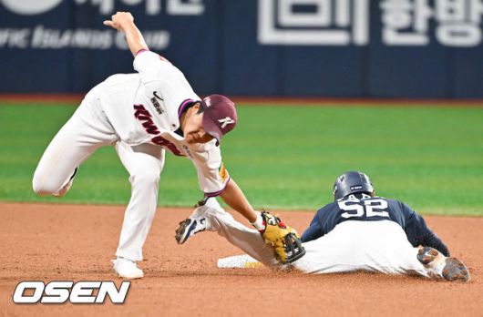 [OSEN=고척, 박준형 기자] 22일 오후 서울 고척스카이돔에서 ‘2025 신한 SOL BANK KBO리그’ 키움 히어로즈와 두산 베어스의 경기가 진행됐다. 이날 키움은 하영민을 두산은 최승용을 선발투수로 내세웠다. 3회초 2사 1루 두산 정수빈의 타석때 1루 주자 박준순이 도루실패하고 있다 2025.04.22 / soul1014@osen.co.kr