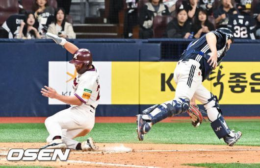 [OSEN=고척, 박준형 기자] 22일 오후 서울 고척스카이돔에서 ‘2025 신한 SOL BANK KBO리그’ 키움 히어로즈와 두산 베어스의 경기가 진행됐다. 이날 키움은 하영민을 두산은 최승용을 선발투수로 내세웠다. 6회말 2사 2루 키움 오선진의 안타때 2루 주자 임지열이 다른 주자 수비하는 사이 홈쇄도해 세이프되고 있다. 2025.04.22 / soul1014@osen.co.kr