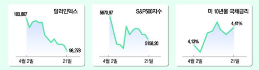 국채와 더불어 안전자산으로서 달러화 지위가 흔들리면서 달러값도 급락했다. 주요 6개 통화에 대한 달러화의 가치를 반영한 달러인덱스는 이날 장중 97.9까지 저점을 낮추며 2022년 3월 이후 3년 만에 가장 낮은 수준으로 떨어졌다.