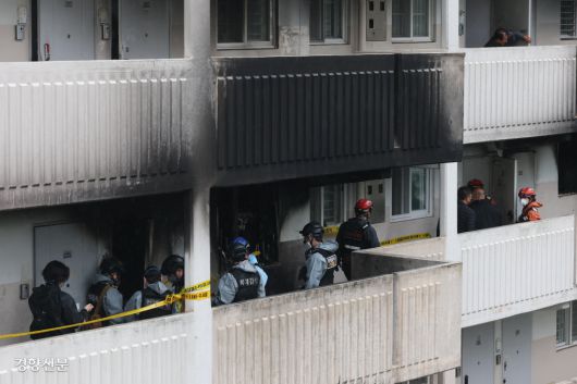 ‘봉천 아파트 화재’ 합동감식 7명의 사상자를 낸 서울 관악구 봉천동 아파트 화재 현장에서 22일 소방당국과 경찰 등 유관기관 관계자들이 합동감식을 벌이고 있다. 한수빈 기자 subinhann@kyunghyang.com |