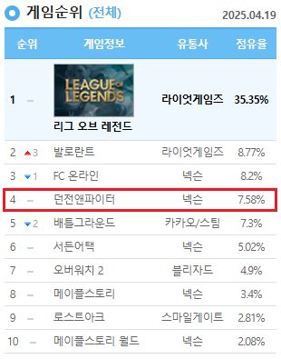 ‘던전앤파이터’ PC방 점유율 (4.19)