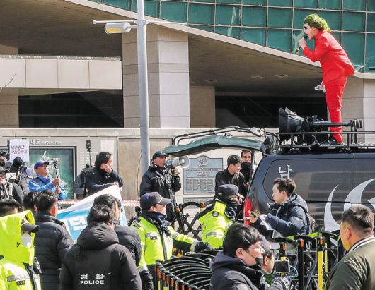 지난 3일 윤석열 대통령 탄핵 찬반 집회가 열린 서울 동작구 중앙대. 빨간색 옷을 입은 한 유튜버가 대형 확성기를 단 승합차 위에 올라가 소리치고 있다. /박성원 기자 |