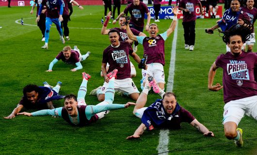 잉글랜드 챔피언십(2부) 번리 선수들이 22일 열린 셰필드와의 2024∼2025시즌 정규리그 안방경기에서 2-1로 승리하며 승격을 확정한 뒤 세리머니를 하고 있다. 2위 번리는 이날 승리로 승점 94가 돼 3위 셰필드(승점 86)와의 격차를 8점으로 벌렸다. 이에 따라 번리는 남은 리그 두 경기 결과와 상관없이 최소 2위를 확보해 리그 최종 순위 1, 2위에 주어지는 잉글랜드 프리미어리그(EPL·1부) 자동 승격 티켓을 획득했다.