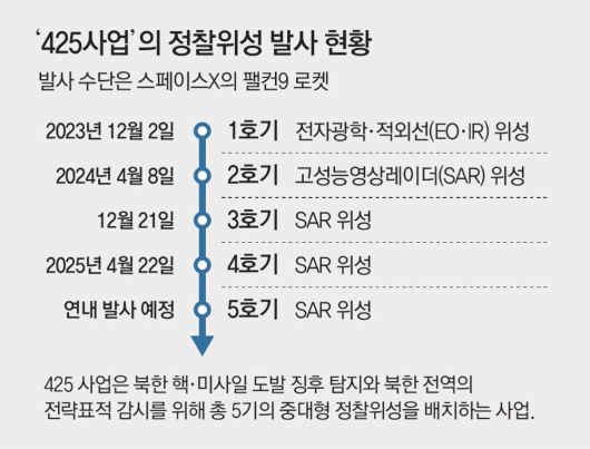 우리 군의 정찰위성 4호기가 22일(한국 시간) 미국 플로리다주 케이프커내버럴 우주군 기지에서 발사됐다. 앞서 발사된 1∼3호기에 이어 4호기도 발사에 성공하면서 우리 군의 대북 감시망은 더 촘촘해지게 됐다. 군은 ‘425사업’의 마지막 정찰위성인 5호기도 연내 발사할 계획이다. 425사업은 북한의 핵·미사일 도발 징후를 탐지하고, 북한 전역의 전략표적을 감시하기 위해 중대형 정찰위성 5기를 확보, 배치하는 사업이다.