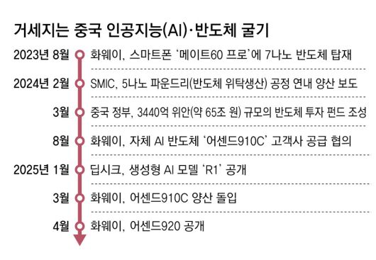 도널드 트럼프 2기 미국 행정부가 중국의 반도체 공급망을 틀어막으며 대중 압박 수위를 높이고 있다. 그럴수록 중국 정부와 기업들은 반도체 자립을 가속화하며 미중 간 기술 패권 경쟁을 장기전으로 몰고 가고 있다. 특히 미국이 엔비디아의 인공지능(AI) 가속기 ‘H20’의 중국 수출 제한을 발표하자 곧바로 화웨이가 자체 AI 반도체 신제품을 선보인 것은 중국의 준비된 대응 카드라는 분석이 나온다.
