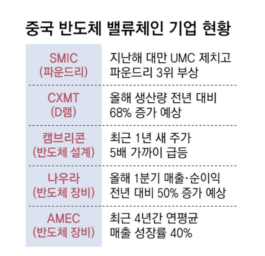 시장조사업체 옴디아에 따르면 중국 최대 D램 업체 창신메모리테크놀로지(CXMT)의 올해 D램 생산 규모는 273만 장으로 지난해보다 68% 증가할 것으로 관측됐다. 중국 AI 반도체 설계 기업 캠브리콘은 적자가 계속되는 상황에서도 엔비디아 AI 칩 수출 통제의 최대 수혜 기업으로 부상하며 지난해 주가가 5배 가까이 올랐다. 중국 최대 반도체 장비 업체 나우라는 올해 1분기(1∼3월) 매출과 순이익 모두 전년 대비 최대 50% 증가할 것으로 전망된다. 중국 식각장비 업체 AMEC 또한 최근 4년간 매출 성장률이 연평균 40%로 빠르게 성장하고 있다.