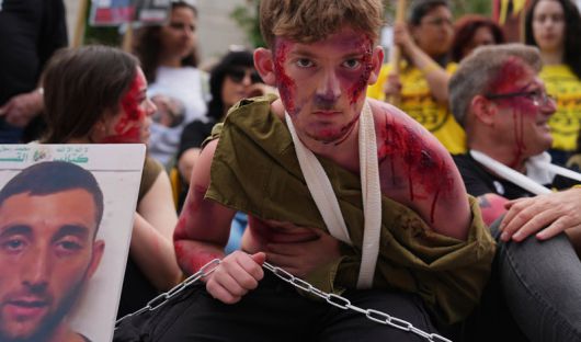 “우리 형을 돌려주세요” 2023년 10월 팔레스타인 무장단체 하마스에 납치된 이스라엘 군인의 남동생이 부상을 입은 분장을 한 채 21일 이스라엘 수도 예루살렘에서 인질 석방 시위에 참여하고 있다. 이날 하마스는 휴전을 위해 가자지구 통치권을 포기할 가능성을 시사했다. 텔아비브=AP 뉴시스 |