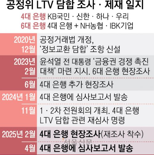 KB국민·신한·하나·우리은행 등 4대 시중은행의 부동산 담보대출비율(LTV) 담합 의혹과 관련해 공정거래위원회가 재조사를 마무리하고 다시 제재 절차를 밟는다. 1차 조사 때와 비교하면 과징금 산정 기준이 되는 매출액이 은행에 따라 2배 전후로 뛰었는데 수천억원대로 전망됐던 과징금이 조 단위로 불어날 수 있단 우려가 커진다.
