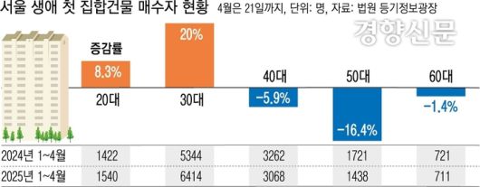 법원 등기정보광장의 22일 자료를 보면, 올해 1월부터 4월 21일까지 서울에서 생애 첫 집합건물(빌라·아파트 등)을 산 사람은 1만3464명으로, 지난해 같은 기간(1만2753명)보다 711명(5.6%) 늘어났다.