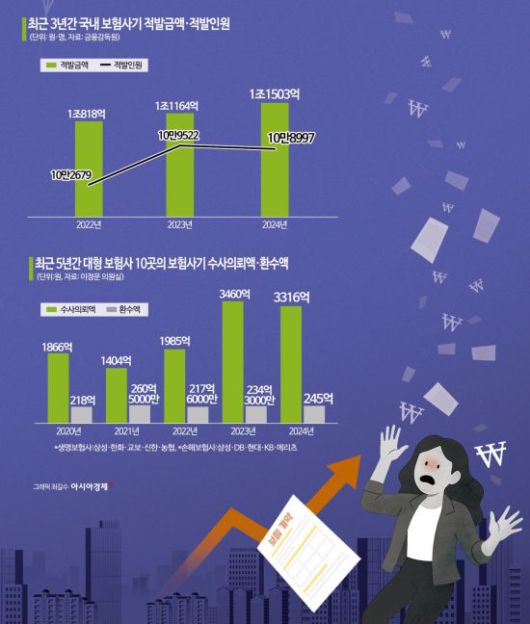 금융감독원 통계를 보면 보험사기 적발액은 2022년 1조818억원, 2023년 1조1164억원, 2024년 1조1503억원으로 3년 연속 1조원을 돌파하며 매년 최대치를 경신 중이다. 이 기간 보험사기 적발인원은 10만2679명, 10만9522명, 10만8997명으로 매년 10만명을 웃돌고 있다.