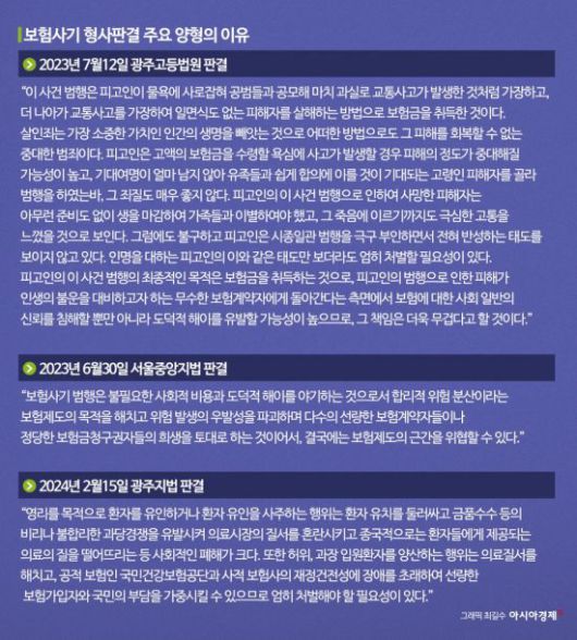 아시아경제는 한 달간 톰슨로이터 로앤비와 대한민국 법원 사법정보공개포털에서 '보험사기'를 중심 키워드로 2023년부터 지난달 말까지 2년3개월간 나온 1·2심 확정판결문 137건을 전부 확보해 분석했다. 분석 결과, 우리나라 보험사기 형사사건 선고 결과는 대부분 벌금형이나 집행유예에 그치는 것으로 나타나 전반적으로 양형이 관대했다. 약식명령에 그쳤다가 정식재판에 회부된 경우도 전체 판결의 3분의 1을 차지했다. 보험사기 대부분은 자동차보험 가입을 통한 사기였고 단독 범행보단 다수가 공모해 범행을 저질렀다. 조직적 수법이나 브로커까지 동원된 지능형 범죄 등 사기의 양상이 점점 교묘해지고 있다는 사실도 확인했다.