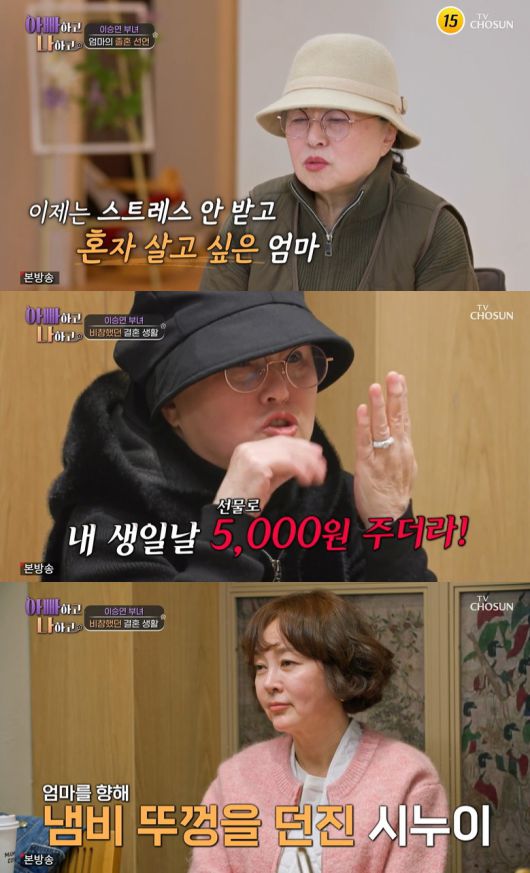 혹독한 시누이 시집살이까지 겪었다던 어머니는 "시누이가 냄비 뚜껑을 던져도 내 편에 한 번도 서주지 않더라"라며 다시금 졸혼 얘기를 꺼냈다.