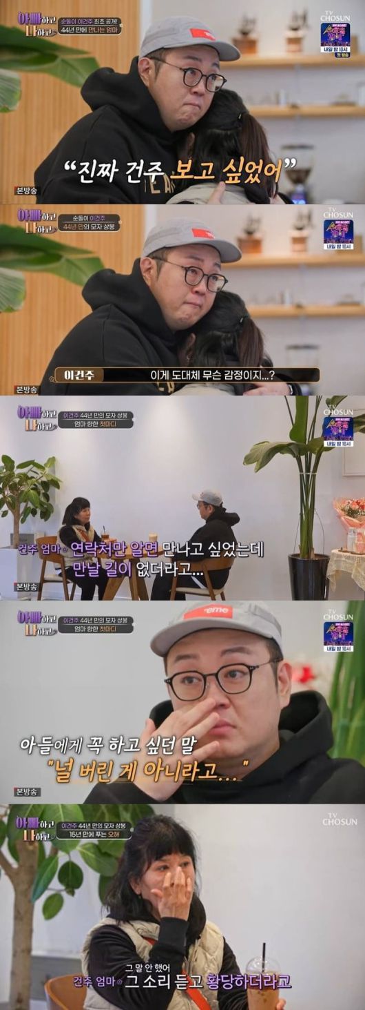 2살 때 이건주와 헤어진 친모는 "나는 너 진짜로 만나고 싶었는데 만날 길이 없었다"며 "어쩔 수 없이 집을 나온 거지 미워서 널 버린 게 아니다. 네가 오해가 있는 것 같더라. 엄마도 속상해서 많이 울었다"고 말했다.