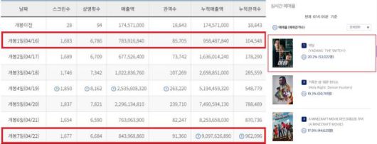 영화관입장권 통합전산망에 따르면 23일 오전 7시 5분 기준, 개봉 7일 차인 지난 22일에 9만 1360명을 동원하며 개봉일 오프닝 스코어인 8만 5705명을 뛰어넘었다. 이는 극장가 비수기로 꼽히는 4월에 개봉했음에도, 끊임없이 쏟아지는 실관람객들의 호평을 바탕으로 달성한 값진 성과라는 점에서 더욱 뜻깊은 의미를 지닌다. 또한 '야당'은 개봉 후 CGV 골든 에그지수와 롯데시네마 관람객 평점이 지난 17일 오전 7시 기준 각각 96%와 9.2점을 기록한 것에서 오늘(23일) 오전 7시 기준 97%와 9.4점으로 상승한 만큼, 웰메이드 청불 영화로 극장가 비수기의 흥행 구원투수 역할을 톡톡히 할 것으로 기대를 모은다.