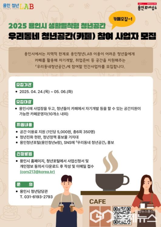 참여 대상은 용인시 관내에서 카페를 운영 중인 사업자이며, 청년들에게 1인당 최대 2시간의 공간 이용과 음료(1회 5,000원 상당)를 지원할 수 있어야 한다. 시는 청년 350명을 대상으로 1인당 최대 6회까지 이용할 수 있도록 지원한다.