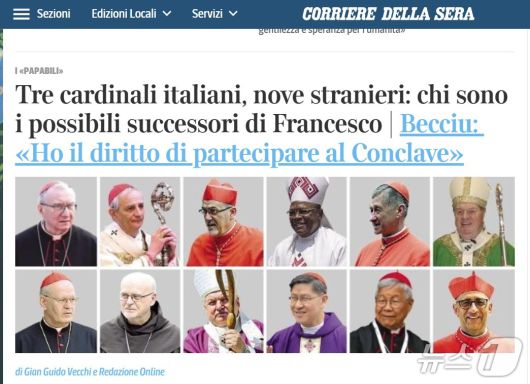 코리에레델라세라 인터넷판 메인 화면. 유흥식 추기경 사진이 아래 줄 우측에서 두 번째에 위치해 있다. (코리에레델라세라 인터넷판 갈무리)