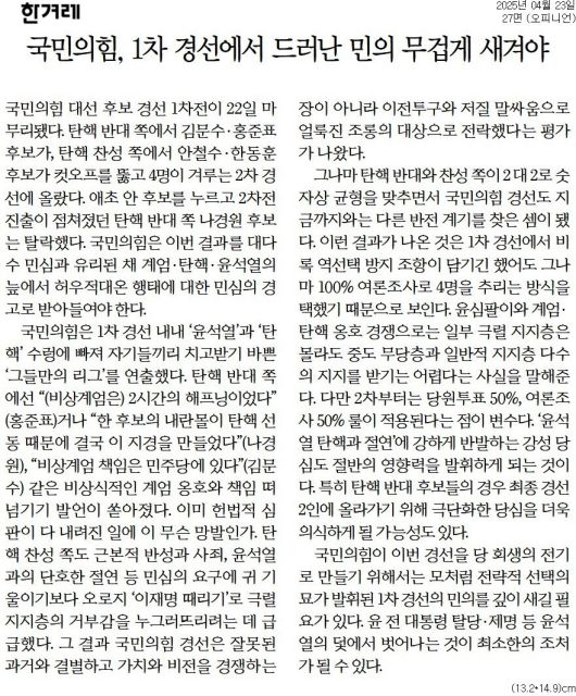 한겨레 = 국민의힘, 1차 경선에서 드러난 민의 무겁게 새겨야