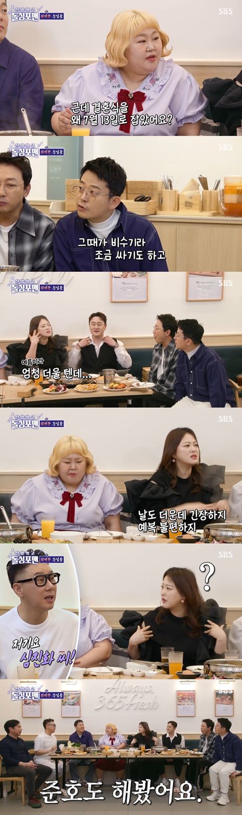 이를 듣던 이상민은 "저기요. 심진화 씨 (김준호도 결혼)해 봤어요"라며 돌싱 김준호에게 돌직구를 날리자, 김원효는 "여름에 안 해봤잖아"라고 덧붙여 모두를 웃음바다로 만들었다.