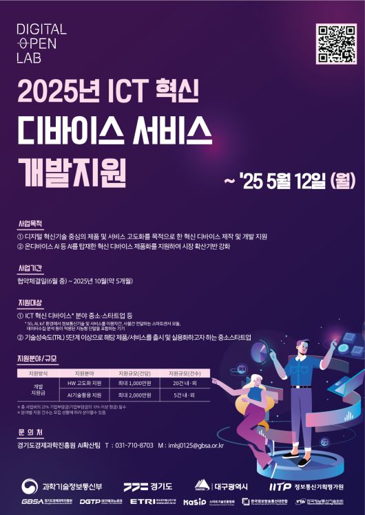 지원대상은 디지털 혁신 기술(AI, 5G, 빅데이터 등) 도입으로 ICT 디바이스 제품 및 서비스의 제작·고도화를 희망하는 전국 소재의 중소·스타트업이며, 신청은 다음달 12일까지 디지털오픈랩 누리집에서 접수하면 된다.