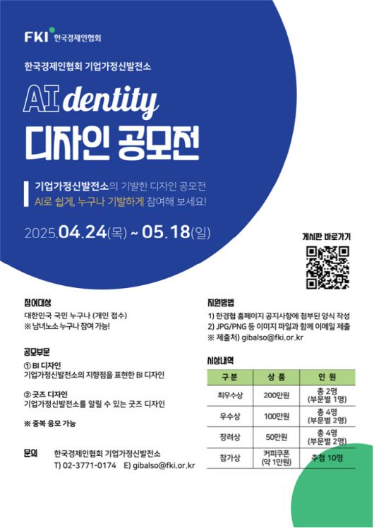 [이데일리 조민정 기자] 한국경제인협회 기업가정신발전소가 ‘에이아이덴티티(AIdentity) 디자인 공모전’을 개최한다.